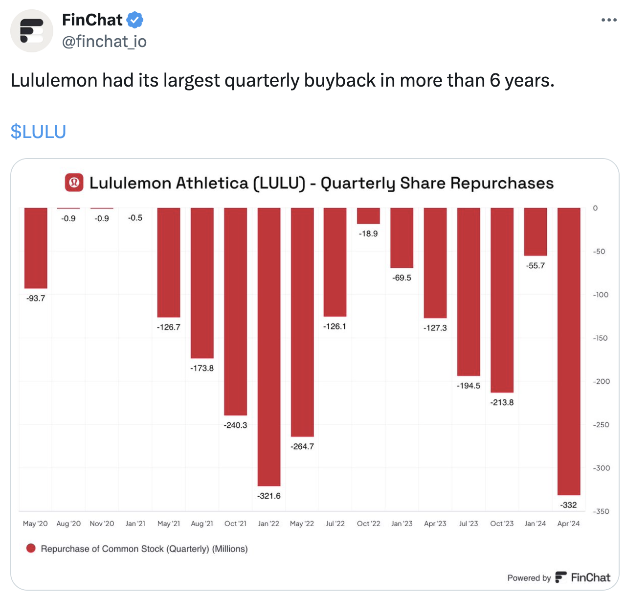 룰루레몬은 올해 1분기 매출이 23억7천만달러를 기록해 시장 예상치인 23억6천만달러를 상회 → 예상치는 상회했으나 가이던스가 좋지 못함