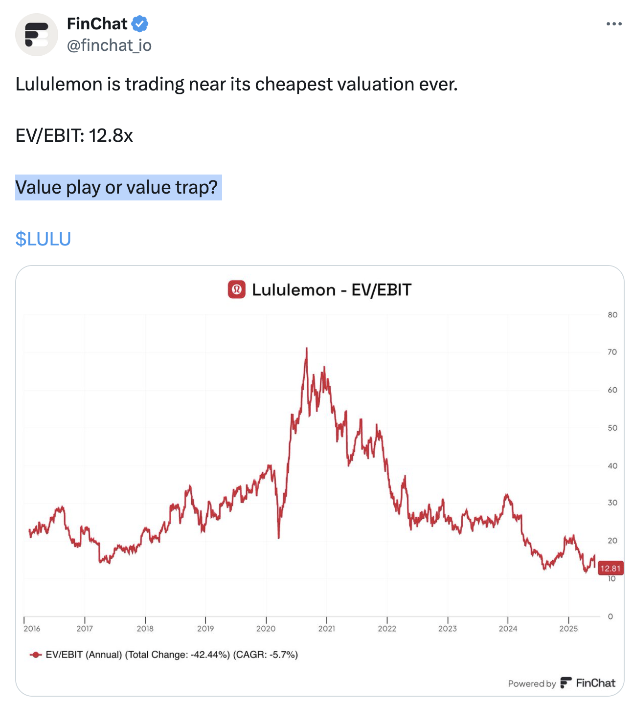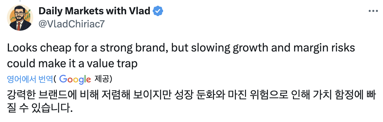 룰루레몬(Lululemon Athletica)은 2025년 6월 1분기 실적 발표 이후 주가가 20% 이상 급락하는 등 심각한 조정을 겪고 있다12. 매출과 EPS가 시장 예상치를 상회했음에도 불구하고 관세 영향과 미국 시장 둔화 우려로 인한 가이던스 하향 조정이 투자자들의 신뢰를 크게 떨어뜨렸다. → 관세! 가이던스 하향!