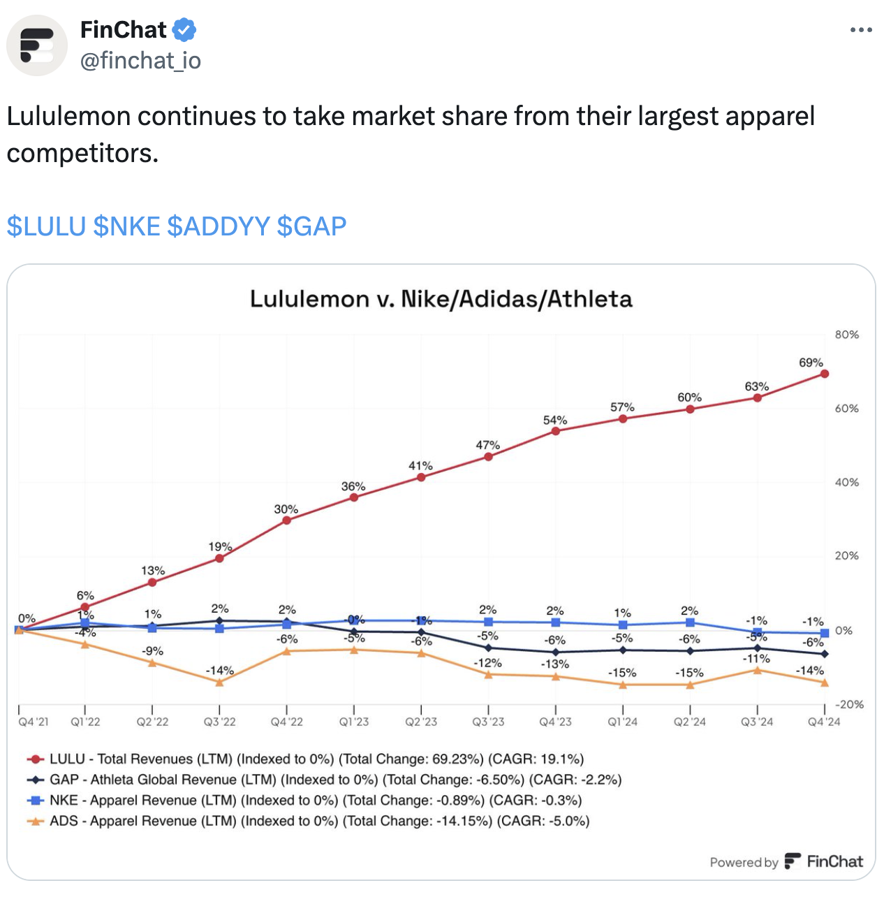 → 아래 그래프를 보면 매출 성장률이 24년 1분기 대비 많이 줄어들었습니다. 더 알아볼 내용은 룰루레몬만 그럴까요? 동종업계의 문제일까요? - 산업 성장률이 둔화하는 것인지 체크해야 함