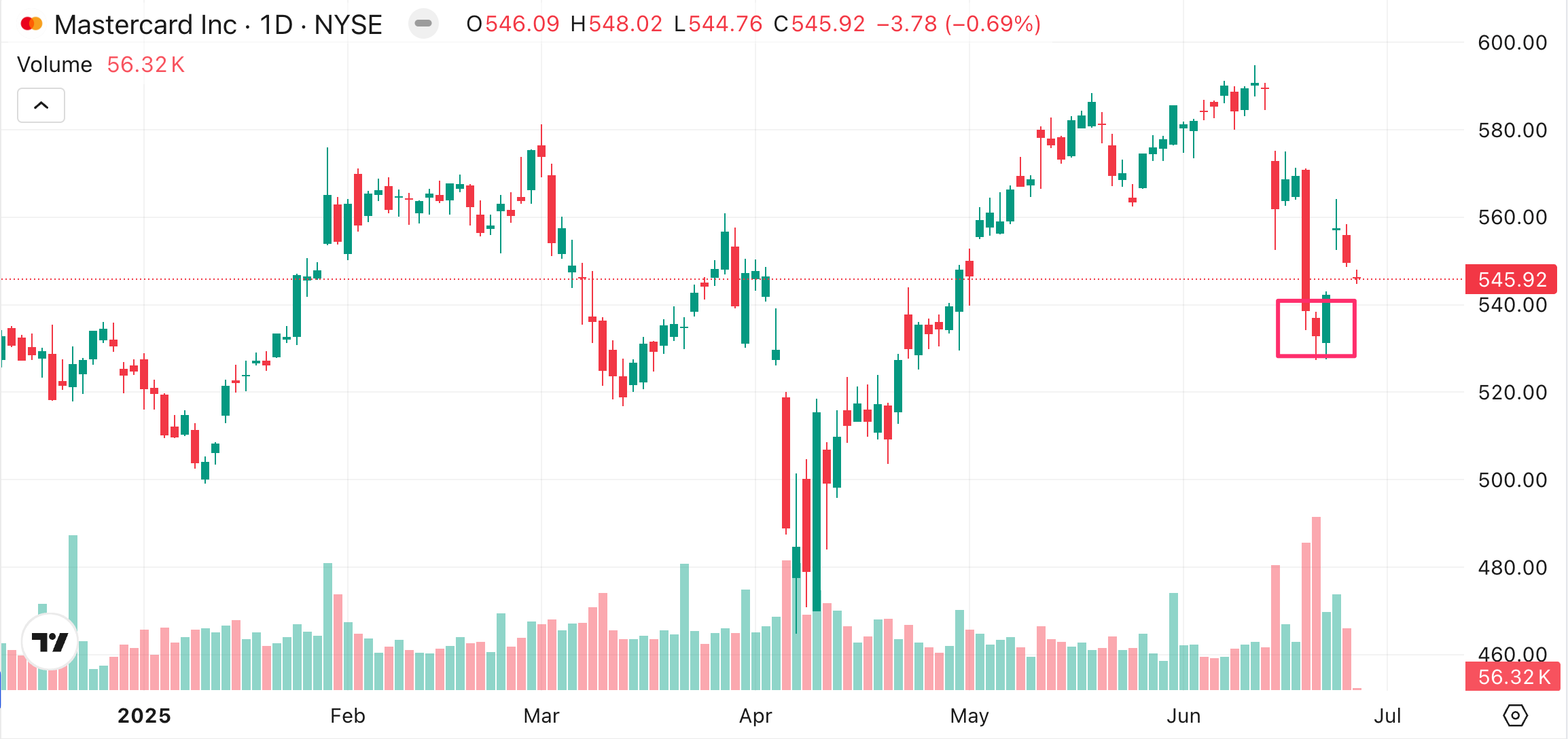 오랜 기간 동안 안정적으로 주가가 상승했던 비자와 마스터카드의 주가가 2025년 6월 18일 급락했습니다.