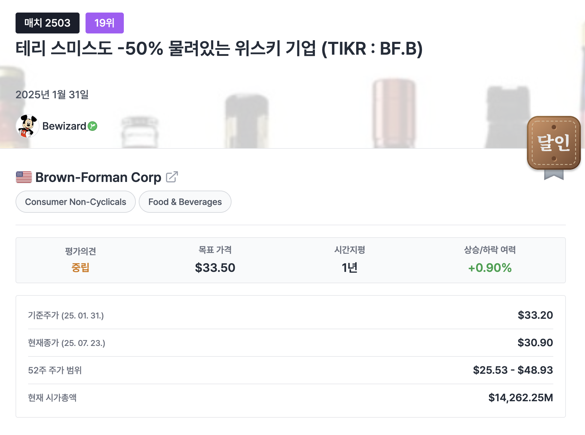 이 기업 역시 고퀄 다작으로 유명한 Bewizard 님의 분석글 "테리 스미스도 -50% 물려있는 위스키 기업 (TIKR : BF.B)"을 보면 기업에 대해서 깊이 있게 이해할 수 있습니다.