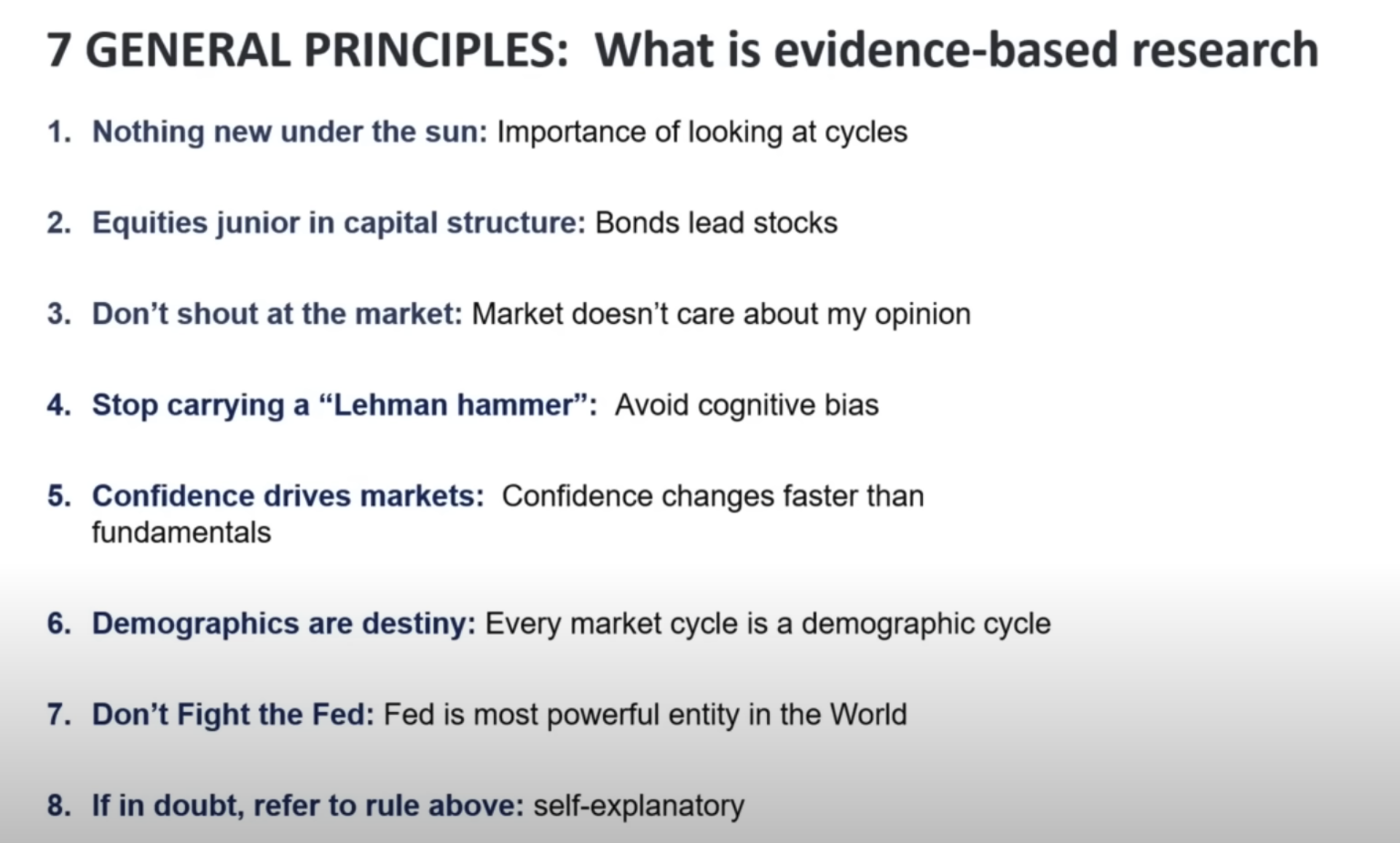 4️⃣ 연준과의 대결 금지: 90%의 경우 연준이 비둘기파적이면 강세를, 매파적이면 약세를 취해야 합니다. 다만 2022-2023년은 예외로, 연준이 표면적으로는 매파적이었지만 실제로는 비둘기파로 전환했기에 강세를 유지했습니다.