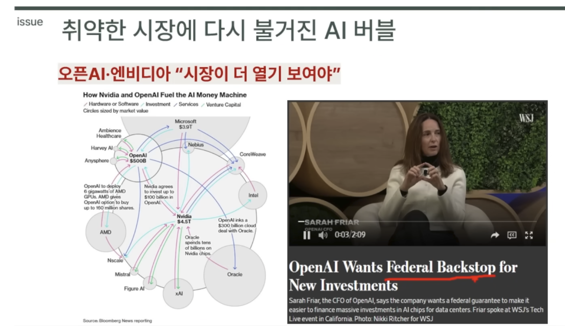 시장 반응: 아직 수익을 내지 못하는 오픈 AI가 1조 달러가 넘는 인프라 투자를 위해 미국 정부(세금)까지 끌어들이려 한다는 점에서 '과잉 투자'와 '버블'의 증거로 받아들여졌습니다. (이후 백악관은 "AI 기업을 구제 금융할 일 없다"고 선을 그었습니다.)