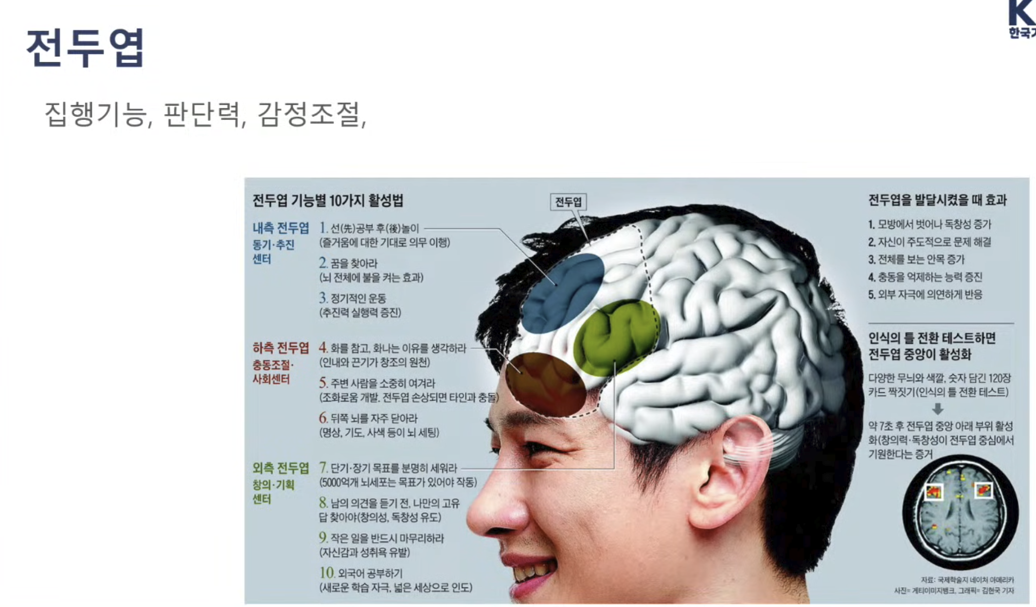 2. 감정 컨트롤: 감정을 조절하는 기능. (교통사고 등으로 전두엽 손상 시 분노 조절이 안 되는 경우가 많음)