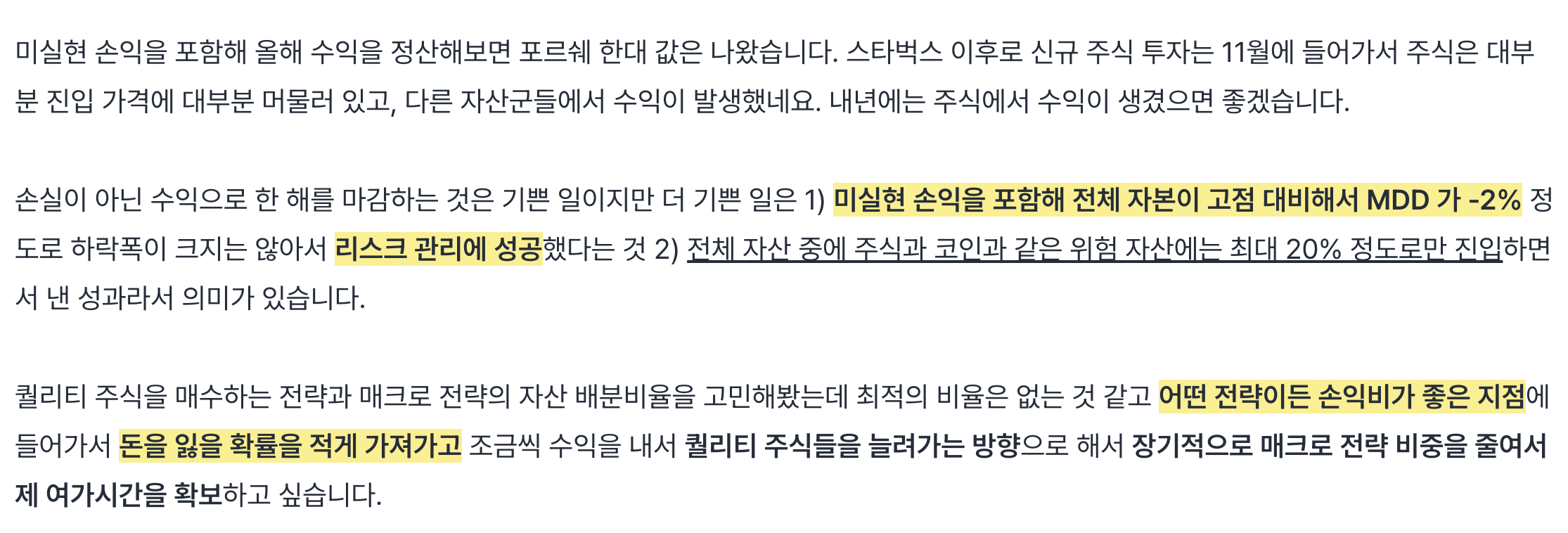 그럼에도 불구하고, 현재로서는 최선이기 때문에 퀄리티 전략으로 자금을 운용하고 있는데 이런 생각이 드는 것을 보면 원래 계획보다 개별 주식 비중이 늘어나서 그런 것 같습니다.