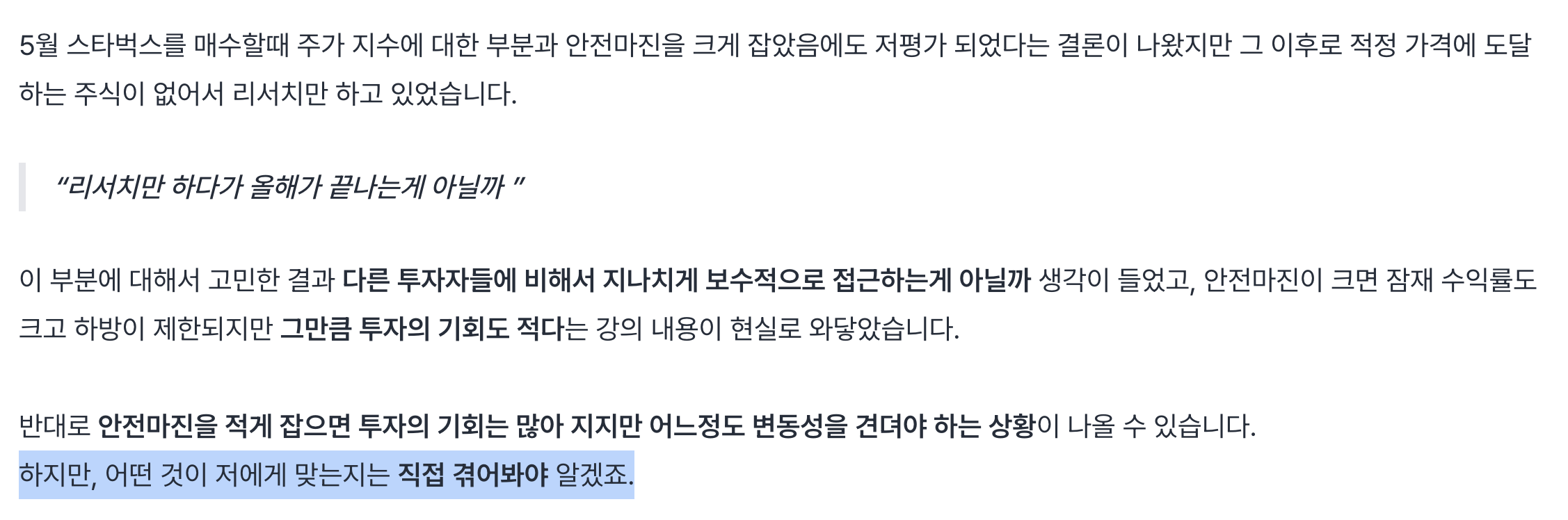 이런 생각들도 실제 투자를 통해서 얻어진 교훈이기 때문에 투자를 통해서 얻은 돈 이상으로 훨씬 값집니다.