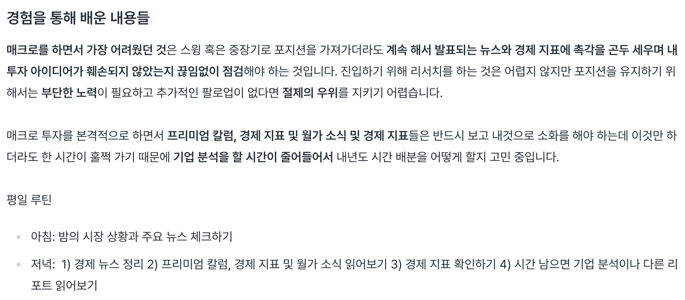 하루 뉴스를 안봤다고 불안해하지 말자. 내일 어떻게 될지가 중요한게 아니라 1년 뒤의 미래의 방향성이 중요하고 이건 하루 아침에 바뀌지 않는다.