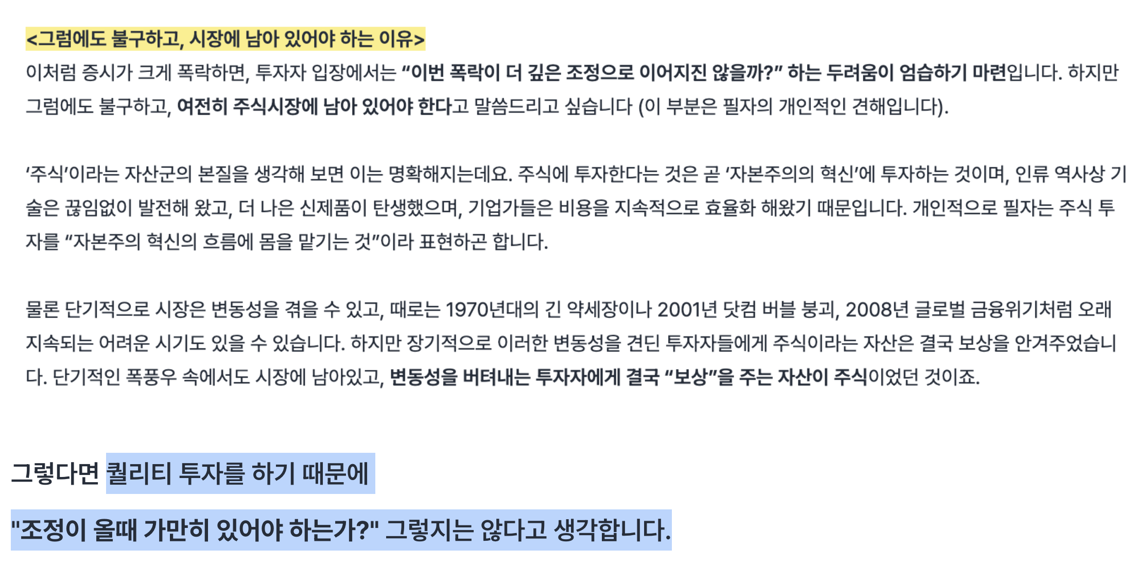 아직 진행한 지 1년도 되지 않았지만, 퀄리티 전략은 결코 마음이 편한 전략이 아닌 것 같습니다.