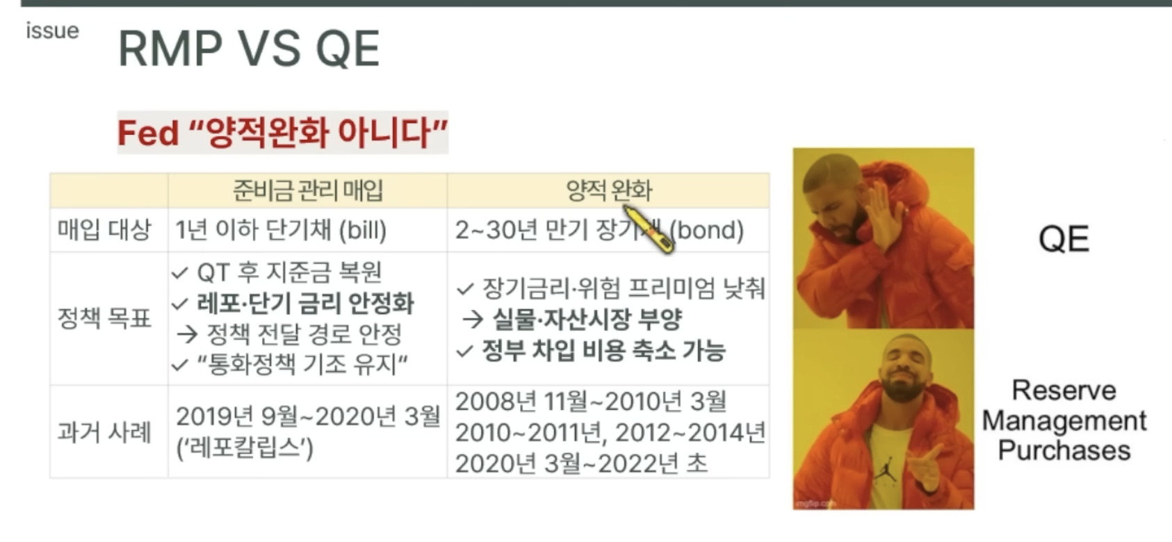 연준(Fed)은 12월 1일부터 지난 3년간 진행해 온 양적 긴축(QT, 시중의 돈을 회수하는 것)을 공식 종료했습니다. 그리고 예상보다 훨씬 빠르게, 더 큰 규모로 '준비금 관리 매입(RMP)'을 시작한다고 발표했습니다.