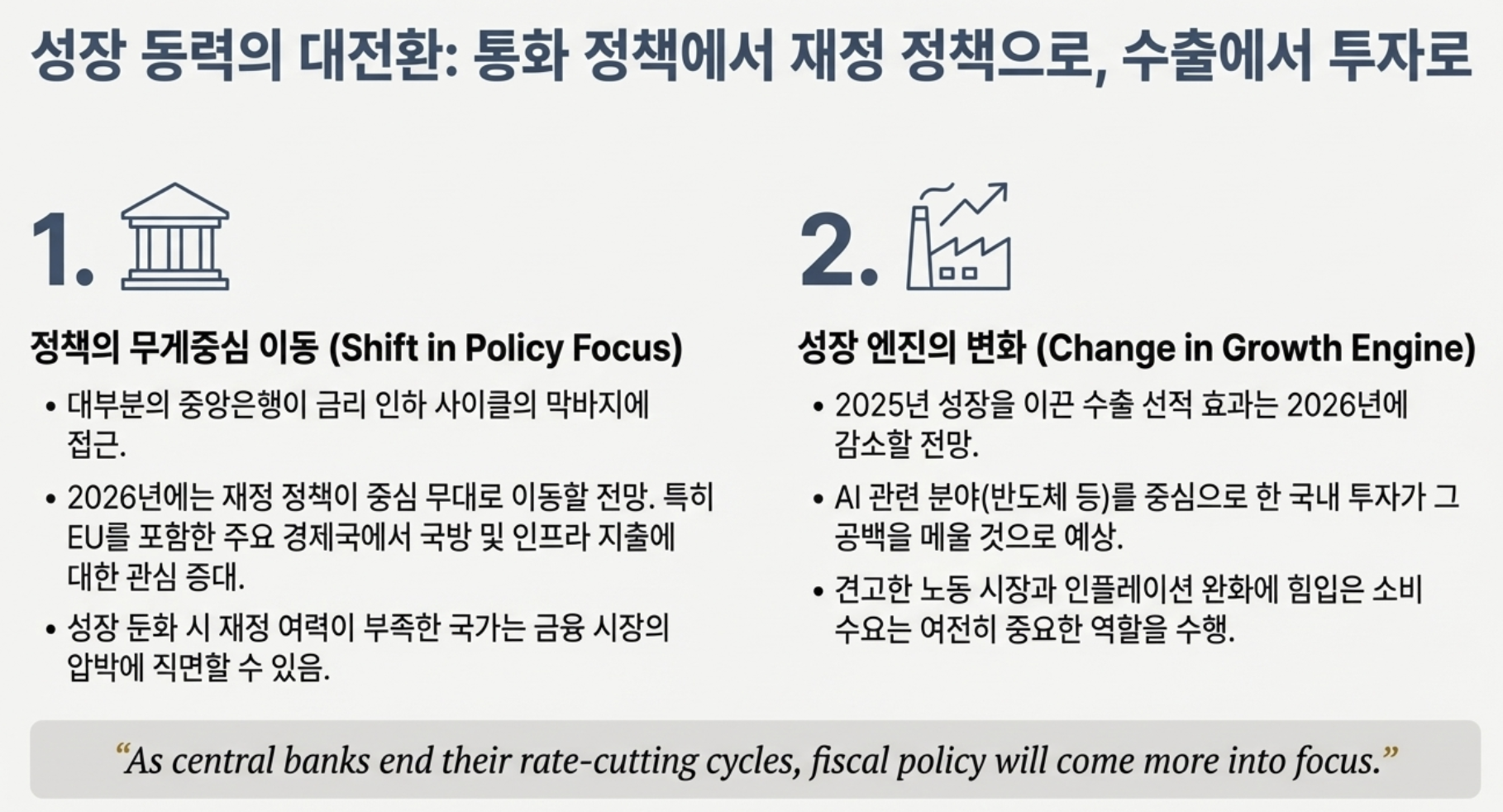 대부분의 중앙은행이 금리 인하 사이클 종료에 근접하면서, 2026년 성장 동력은 재정정책으로 이동합니다. EU를 포함한 주요국에서 국방비와 인프라 지출 확대가 예상됩니다.