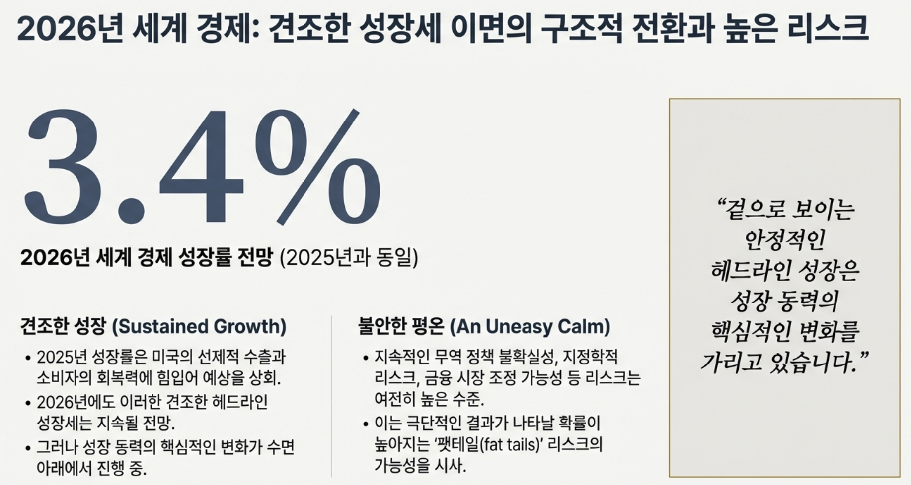 2026년 글로벌 성장률 3.4%는 2025년과 동일하지만, 성장 동력은 근본적으로 달라집니다.