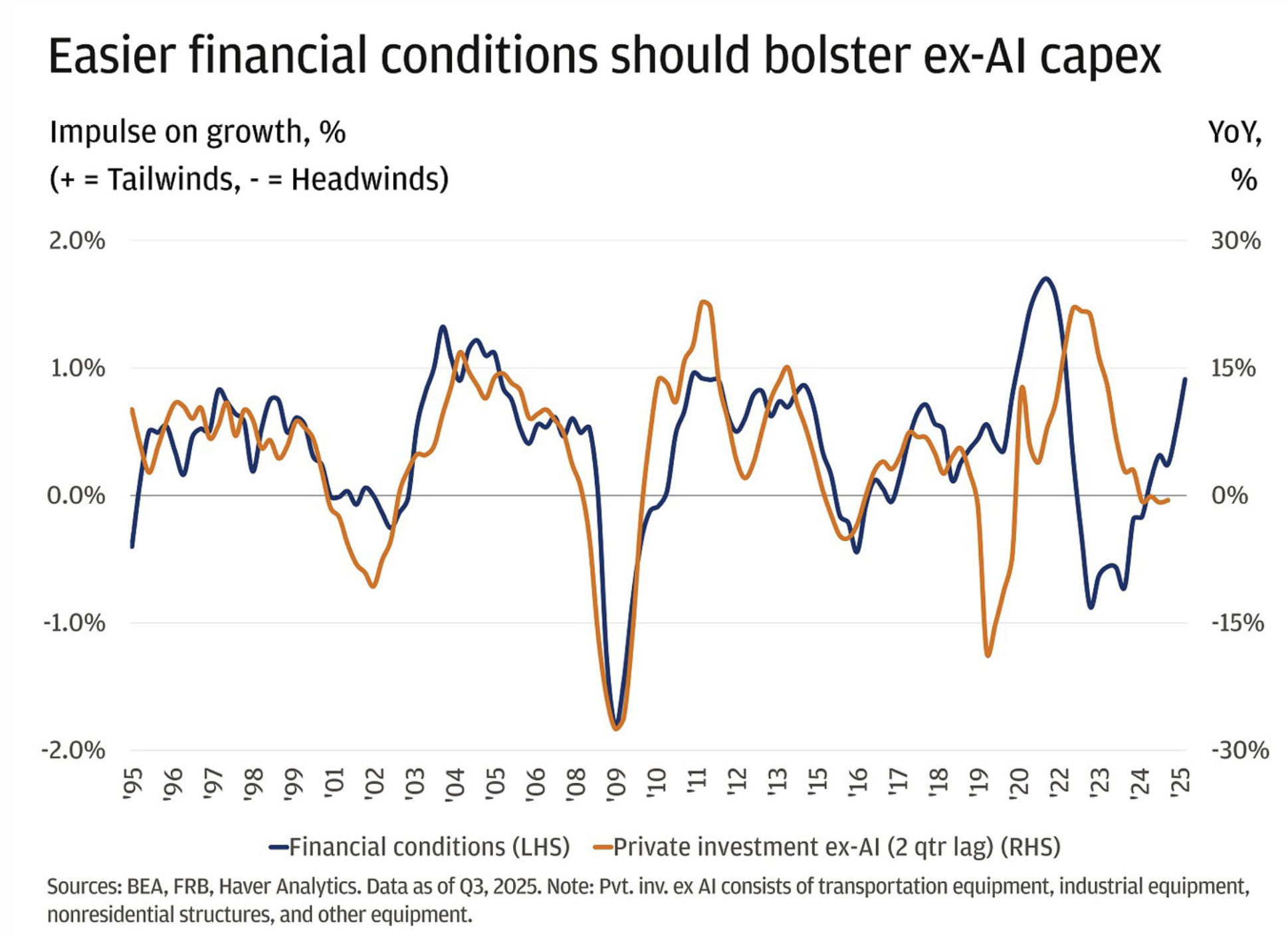 J.P. Morgan이 보라는 건 "AI 외" 투자예요. 운송장비, 산업기계, 비주거 건설. 금융여건이 완화되면서 전통 산업재 투자도 같이 확대된다는 논리입니다.