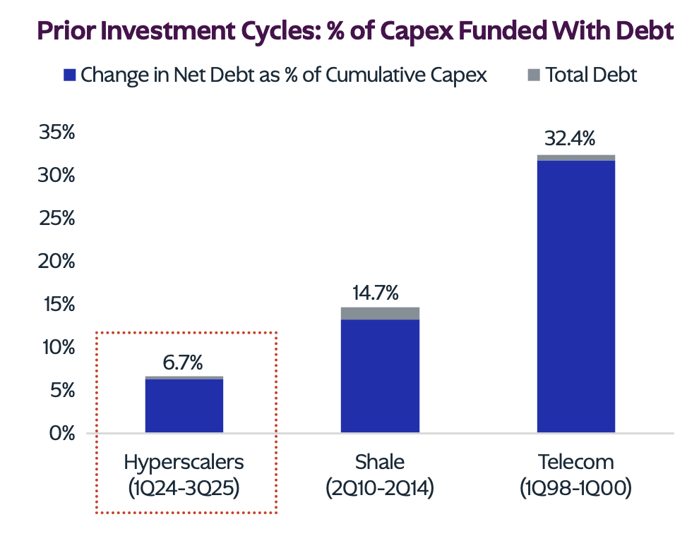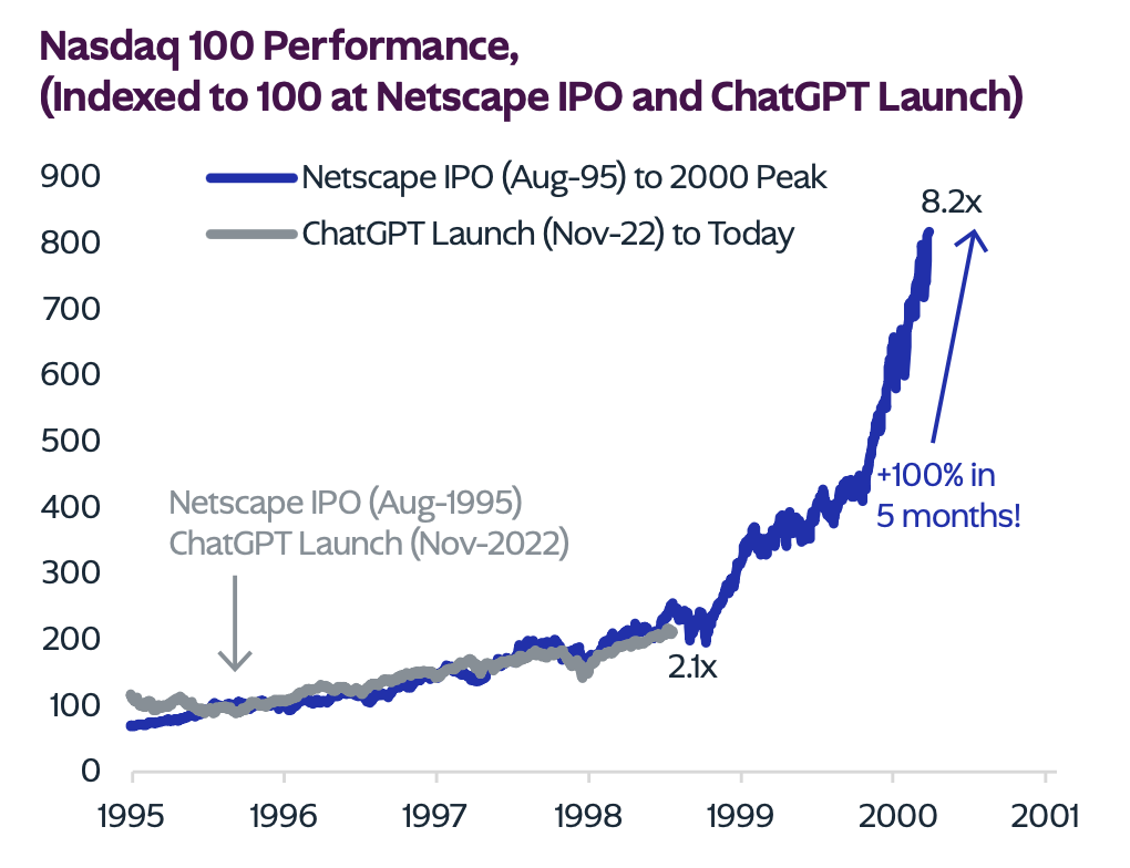 ChatGPT 출시(2022년 11월) 이후 Nasdaq 100은 2.1배 상승했습니다. 이는 Netscape IPO(1995년 8월) 이후 2000년 고점까지 8.2배 상승한 것과 비교하면 아직 여유가 있어 보이지만, 내재 성장 기대치는 이미 상당히 높습니다.
