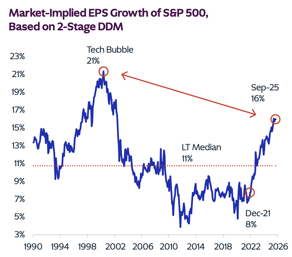 생산성 혁명의 과실이 이미 자본시장 가격에 상당 부분 반영되었습니다. S&P 500의 10년 내재 EPS 성장률은 현재 약 16%로, 장기 중앙값 11%를 크게 상회합니다.