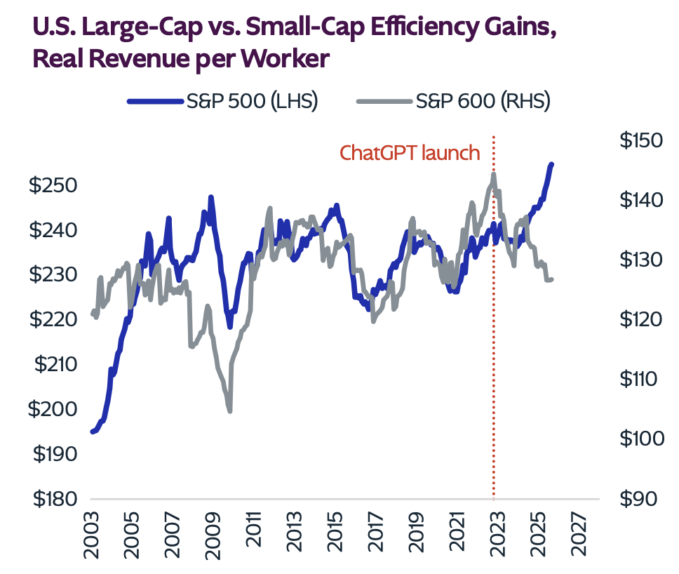 대형주 vs 나머지의 극단적 분기: 기술 투자 역량 차이로 인한 마진/성장 격차가 확대됩니다. AI 투자 여력이 있는 대형주만 생산성 향상의 과실을 가져가고, 중소형주는 오히려 뒤처지고 있습니다. → 대형 우량주 선호, 중소형주(S&P 600) 비중 축소