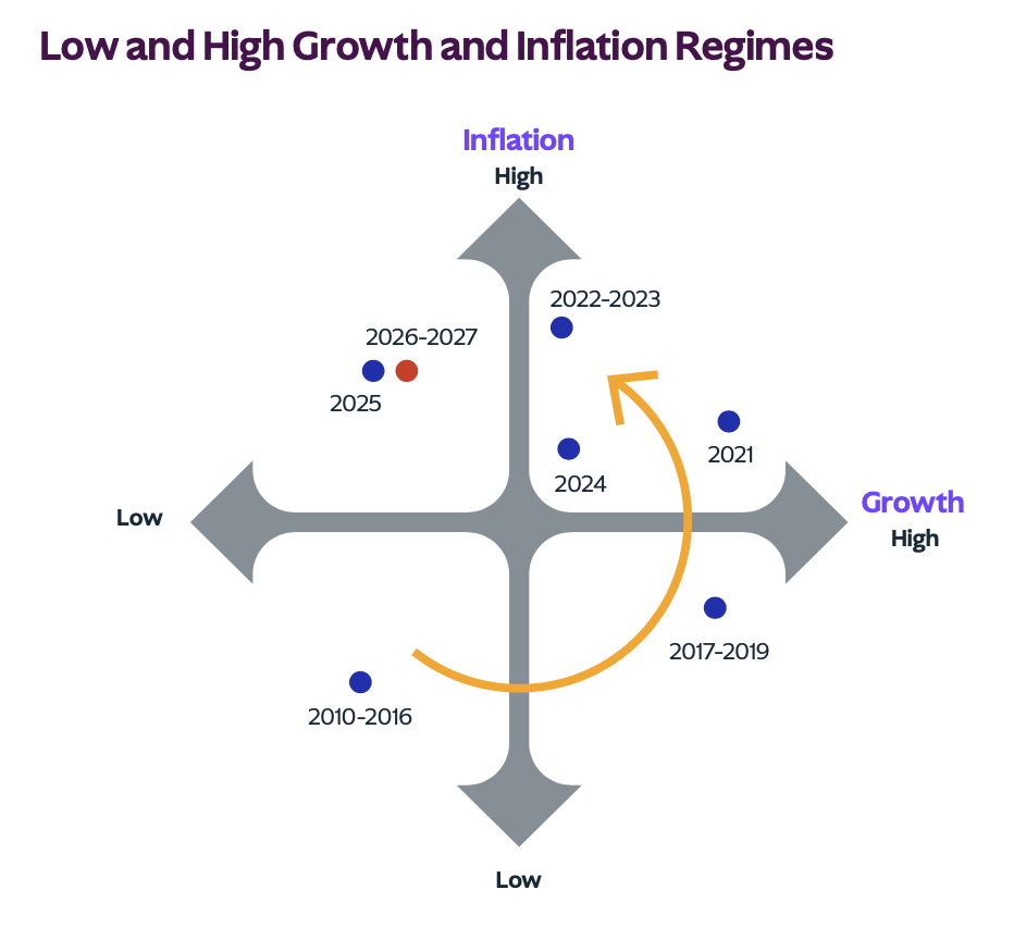 인플레이션의 구조적 상승: 미국, 영국, 일본은 높은 인플레이션 환경이 지속됩니다. 반면 중국은 디플레이션, 유럽은 균형점에 있어 지역별 차별화가 심화됩니다.