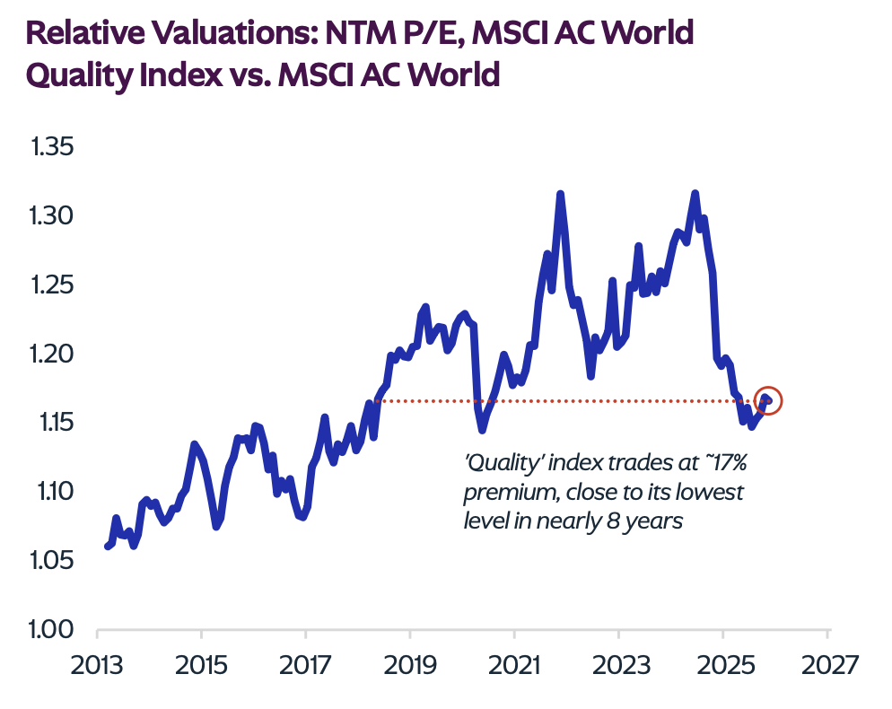 지역별로는 아시아 비중 확대를 권고합니다. 일본은 기업 개혁의 최전선에 있으며, 시장의 40%가 여전히 장부가 이하에서 거래됩니다. 한국도 기업 개혁 모멘텀이 살아나고 있고, 70%가 장부가 미만입니다. 인도는 소비 업그레이드 사이클의 수혜국입니다.