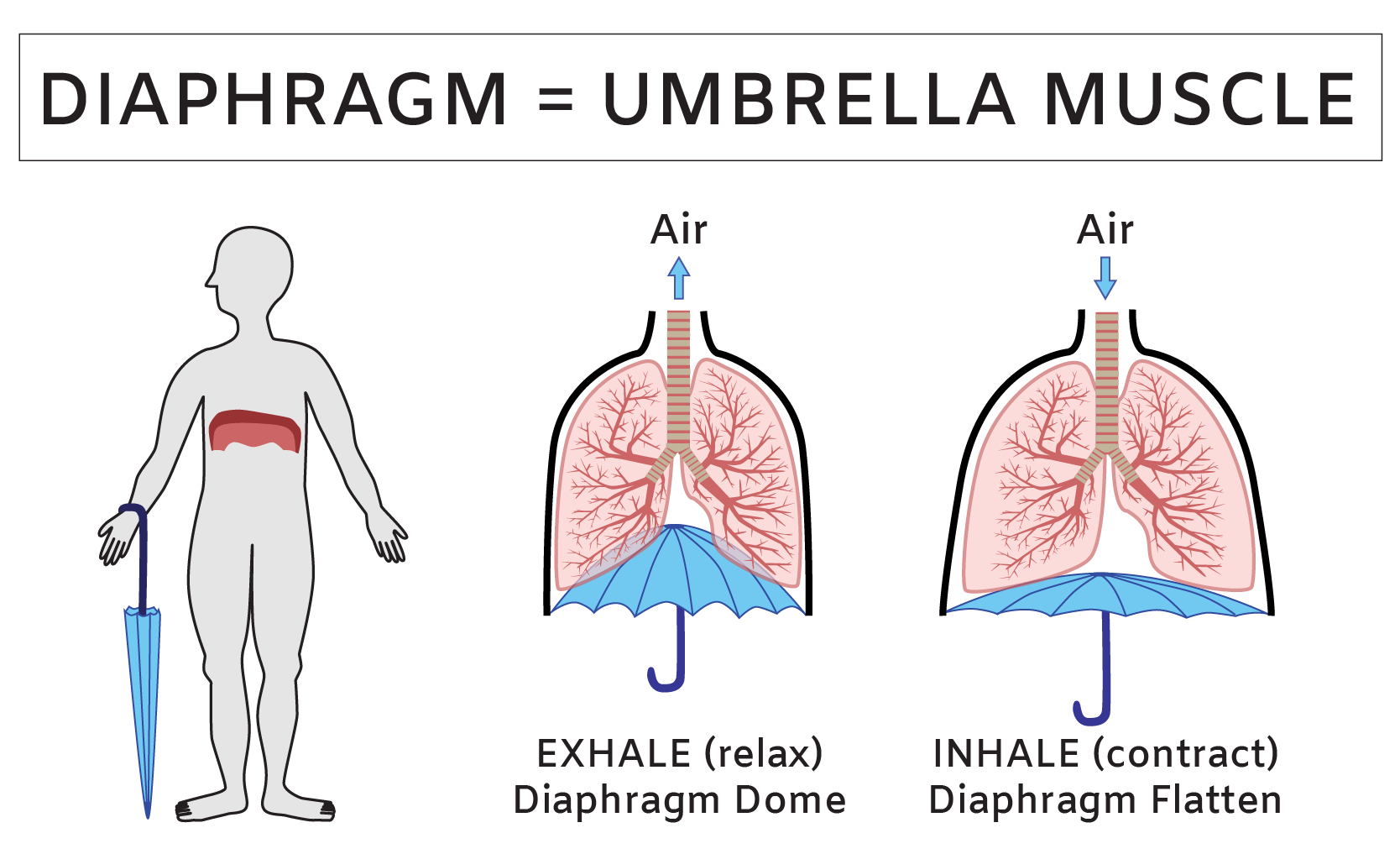 이렇게 갈비뼈의 아래쪽을 막고 있는 근육으로 수축하면 폐를 펴는것같이 아래로 잡아당기면서 '흡기'를, 이완되면 쭈그러들면서 '호기'를 담당하는 특이한 근육입니다. 이 근육이 숨을 쉬는데 쓰라고 만들어진 '메인'근육이고 호흡과 관련해서는 '코어'근육으로 소개해드린 내부의 근육들이 모두 사용된다고 생각하시면 됩니다.