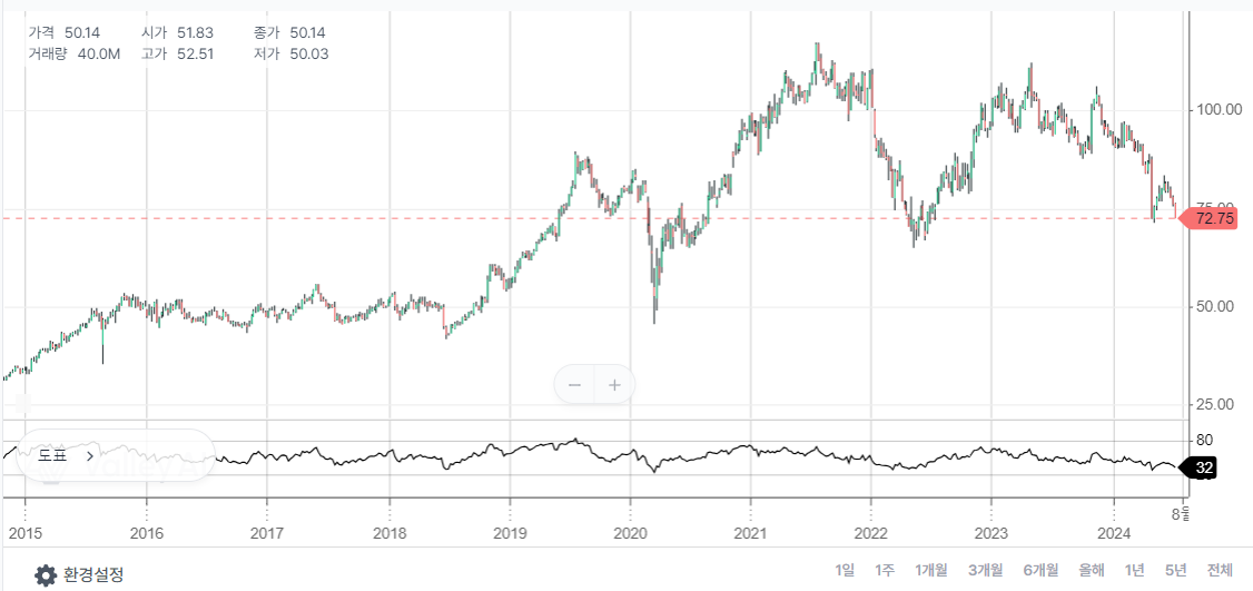 -> 나에게 가장 충격을 주었던 스타벅스와 나이키의 직전분기 -20%의 여파(이런 국밥주식도 이정도로 떨어진다고?!) 이후 반등이 있다가 다시 고꾸라지는 모습.