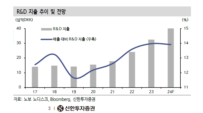 위고비/오젬픽 성공 이후 새로운 치료제 개발을 위해 연구개발비 + CAPEX + 인수합병 활발하게 진행 중. -> 후발 주자와의 격차를 크게 벌리려는 노력 열심히 하고 있다. (제약 업계 재무제표 비용처리에 대해 자세히 모르지만, 그래도 엄청난 자본효율성의 기업이라 모든 투자소식은 긍정적인 편)