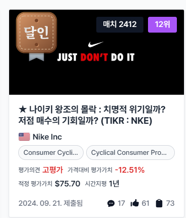 감히 다모다란 교수님과 함께 쓰는 것에 얼굴이 화끈거리지만.. 그래도 내가 생각했던 나이키 적정주가는 $75 전/후 (평단도 똑같음)