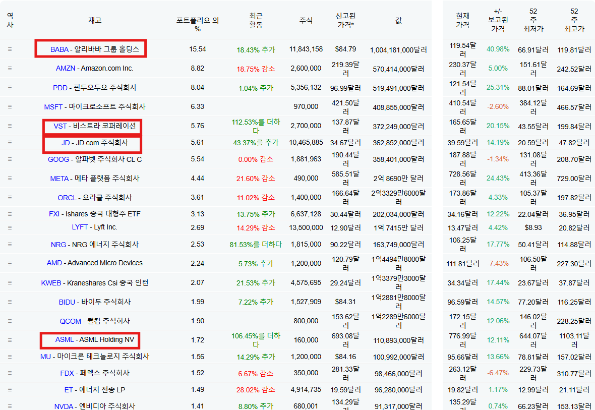 여전히 중국주식 베팅 확대 : 마이클 버리와 함께 비중이 제일 큰 알리바바, 징동 이 두 종목 위주로 괜찮아보인다.