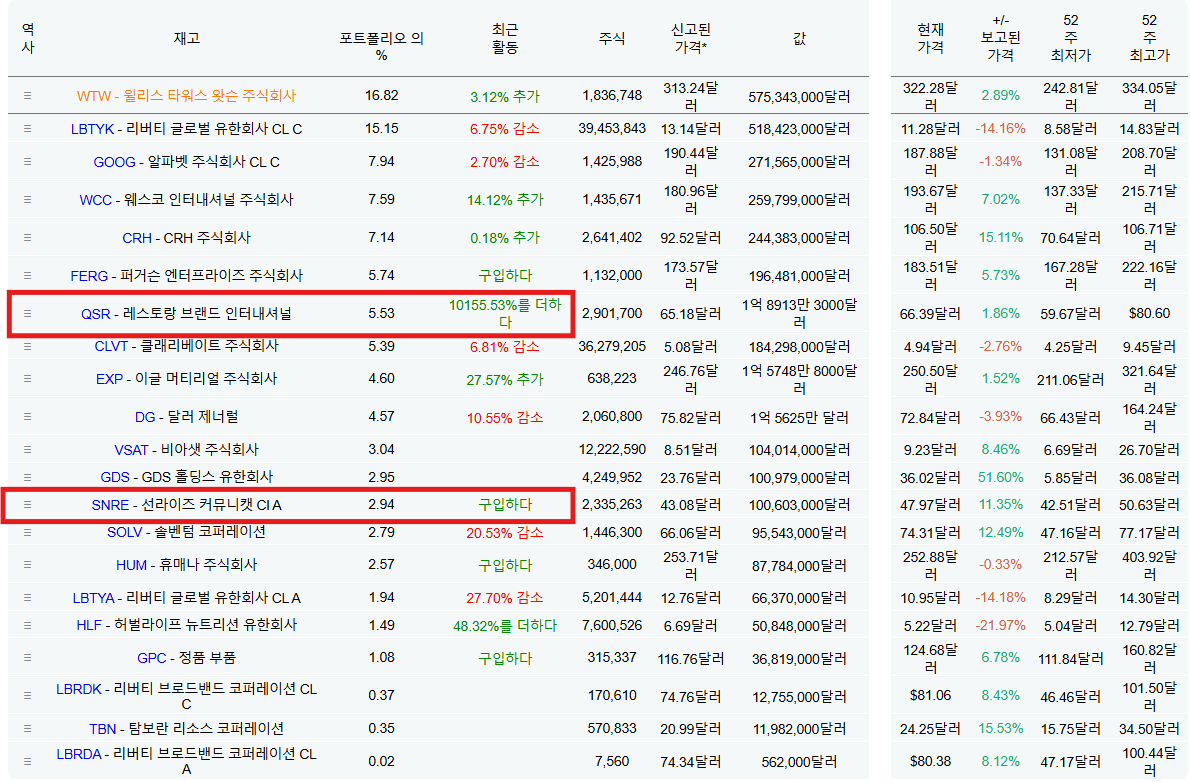 (오늘, 내일 거의 다 발표되겠지만 지금까지 나온 13F 공시들 → 유의미한 비중으로 투자한 것만 담아봤다.)