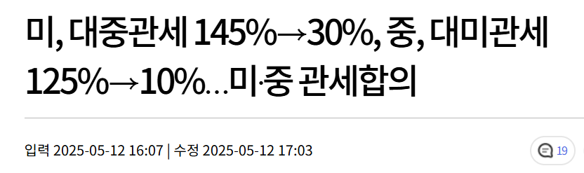 이유는 중국과 미국의 관세 90일 연기 각각 30%, 10% 부과로 변경.. (애초에 하질 말던지)