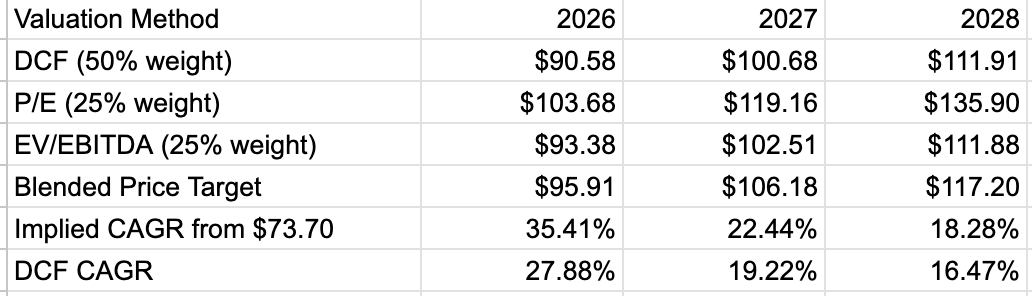 본 보고서는 PayPal Holdings, Inc.(PYPL)의 포괄적인 재무 가치를 평가하고 2026년, 2027년, 2028년 회계연도의 주가 전망을 제시합니다. 본 분석은 할인현금흐름(DCF), 주가수익비율(P/E), 그리고 기업가치/EBITDA(EV/EBITDA)의 세 가지 가치 평가 방법을 사용합니다. DCF 모델에 50% 가중치를 적용한 당사의 혼합 목표 주가는 2026년 $95.91, 2027년 $106.18, 그리고 2028년 $117.20입니다. 이러한 목표 주가는 예측 기간 동안 현재 주가에서 연평균 성장률(CAGR) 9.2%에서 12.9%로 증가할 것으로 예상합니다.