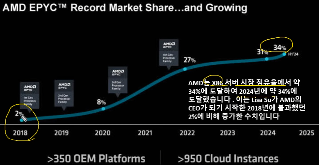 리사 수가 시작했던 2018년도에 비해서 현재는 34%정도로 서버시장에서 점유율을 높여가고 있음.