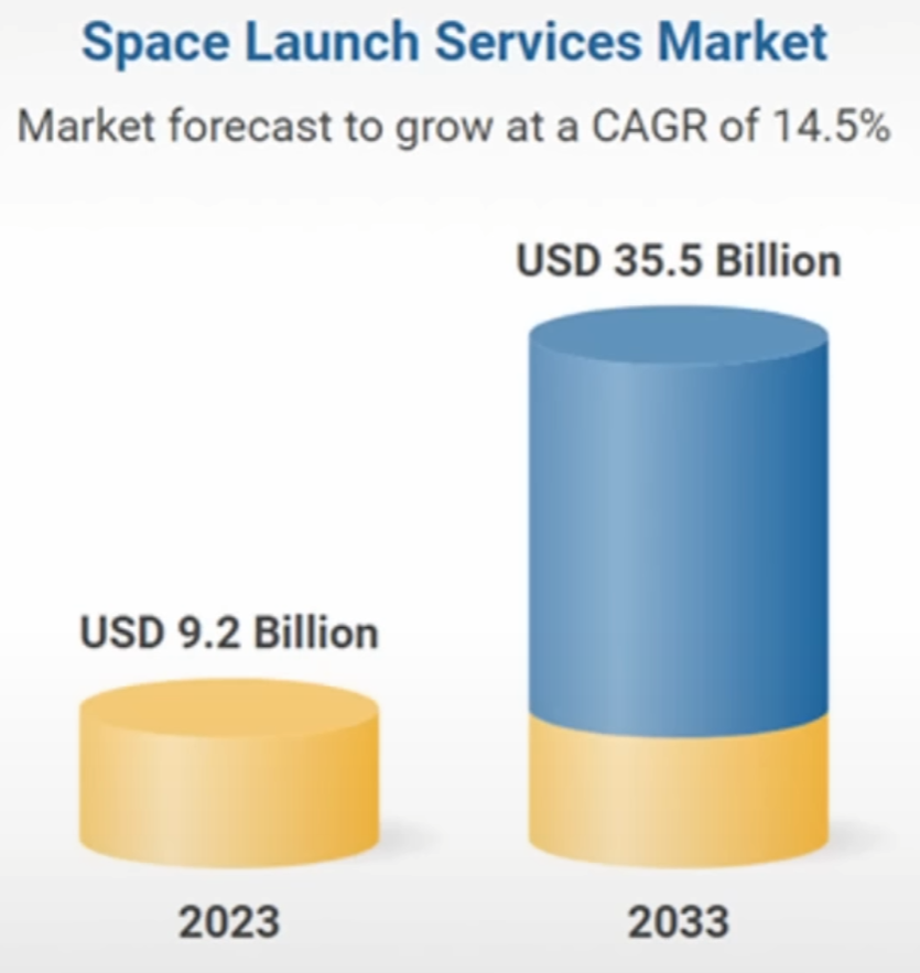 ** 발사 서비스 시장의 성장 (23년 9.2B -> 33년 35.5B) CAGR 14.5%