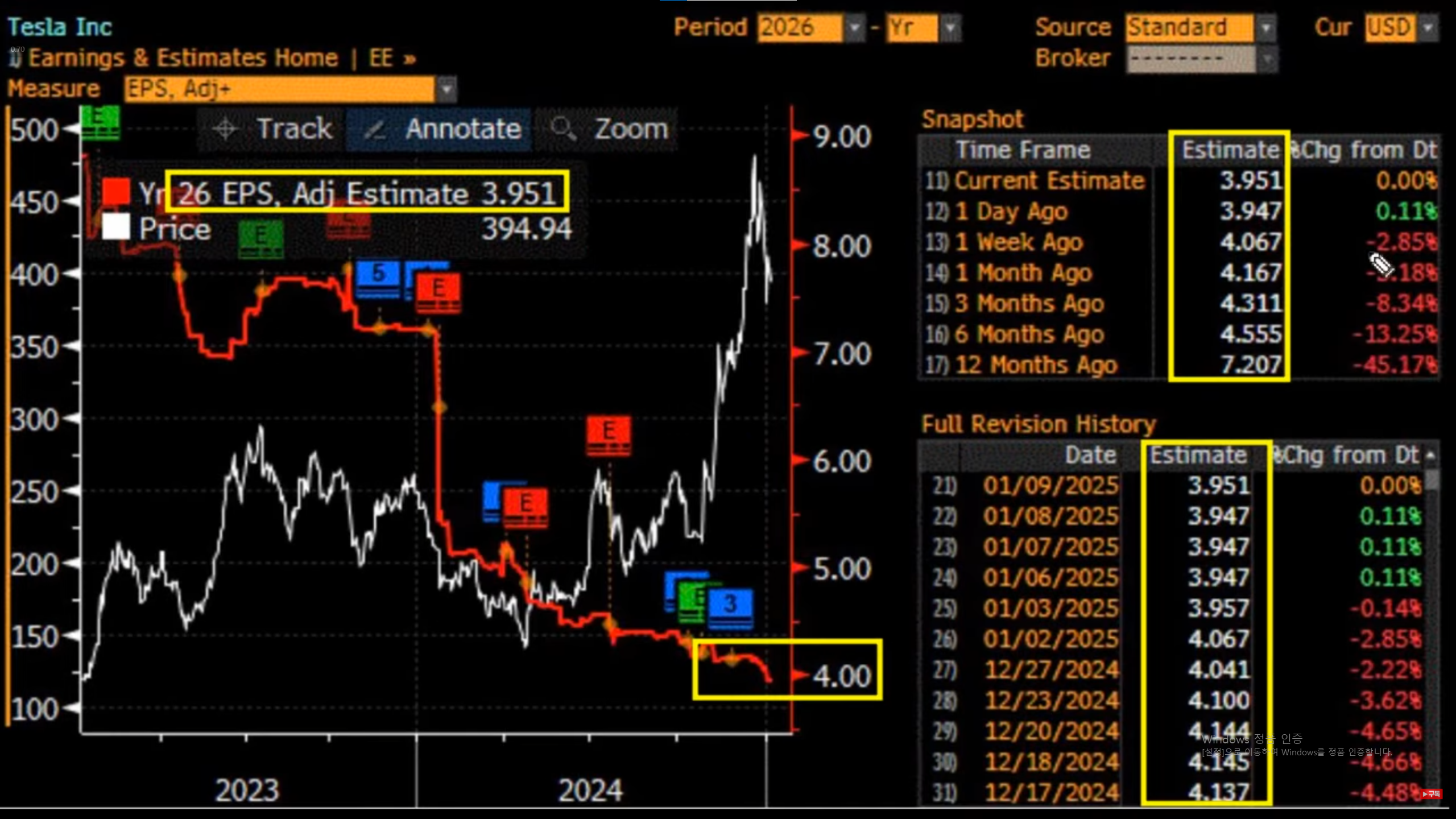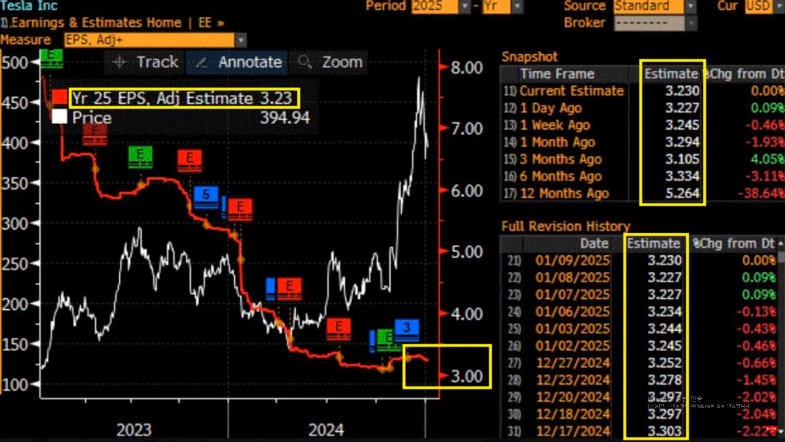 Revision hx를 보면 24년 12월 17일 전망치는 3.303이었다가 25년 1월 9일에는 3.23으로 약간 줄어듬.