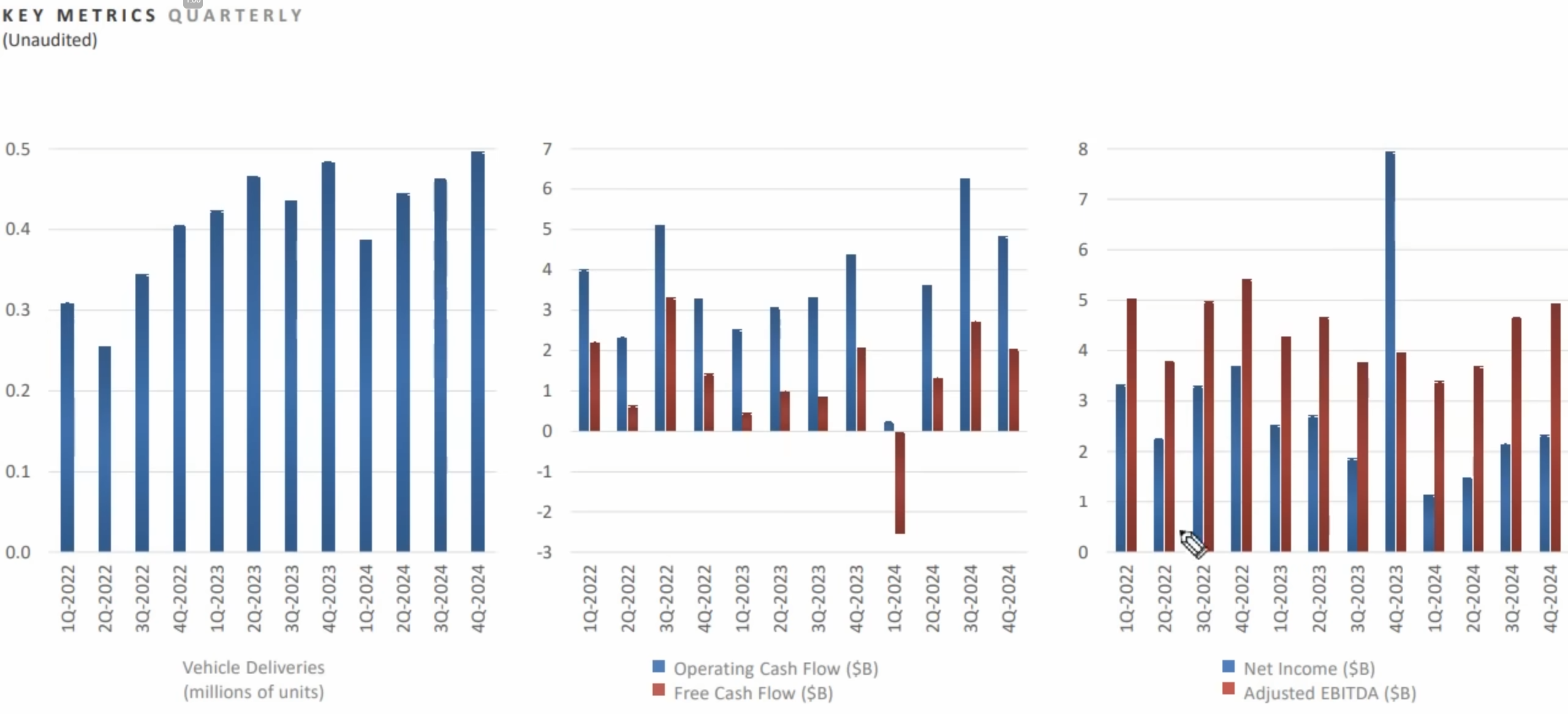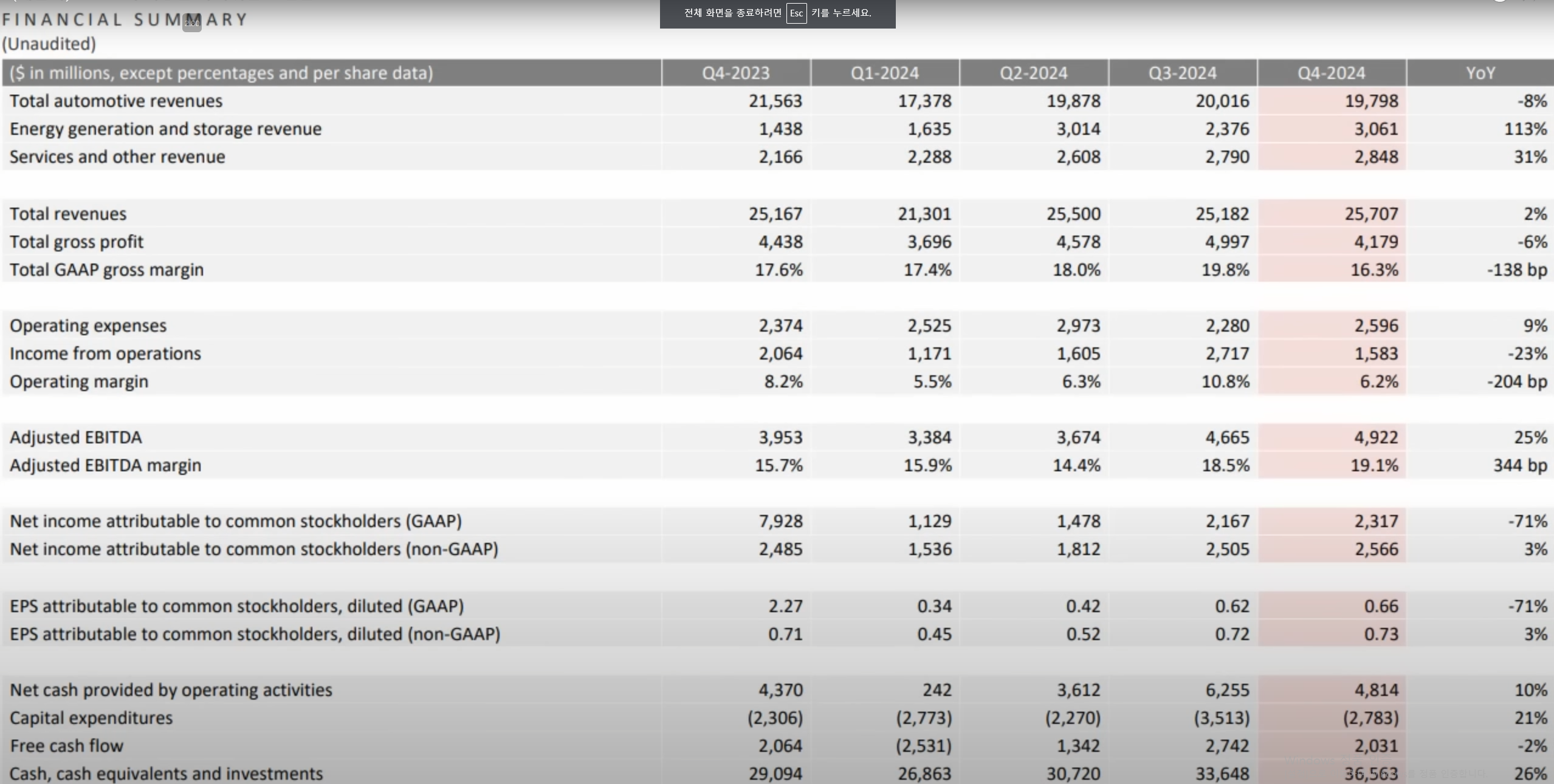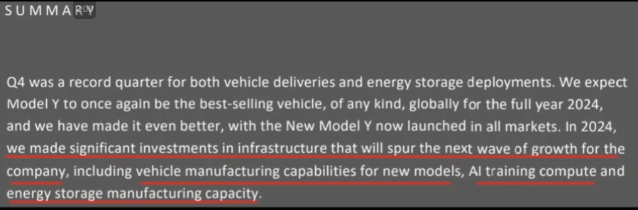 24년도에 infra (자동차 신모델 제조, AI, 에너지 저장장치) 투자가 많았다. 특히 FSD 가 유럽과 중국에서 런칭할 계획이므로 25년이 정말 중요한 해가 될 것이라 함.