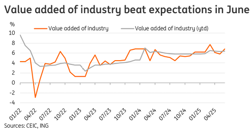 6월 월별 데이터에서 가장 큰 상승세를 보인 것은 산업 부가가치로, 놀랍게도 5월의 5.8%에서 3개월 만에 최고치인 6.8%로 반등하여 예상치를 뛰어넘음.