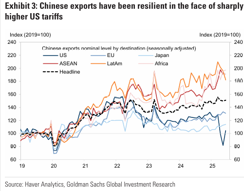 무역은 견조했고, 2분기에는 달러 기준 전년 동기 대비 6.2% 성장. 관세 영향이 본격적으로 나타나는 하반기에는 수출이 감소할 것으로 예상. 그러나 불확실성이 상당하며, 향후 몇 달 동안 중국 수출이 계속해서 예상치를 웃도 는 상승세를 보일 가능성이 있음.