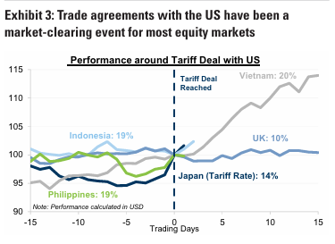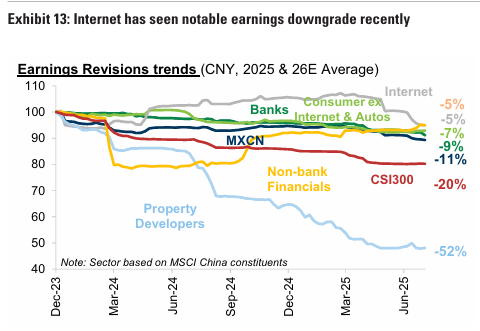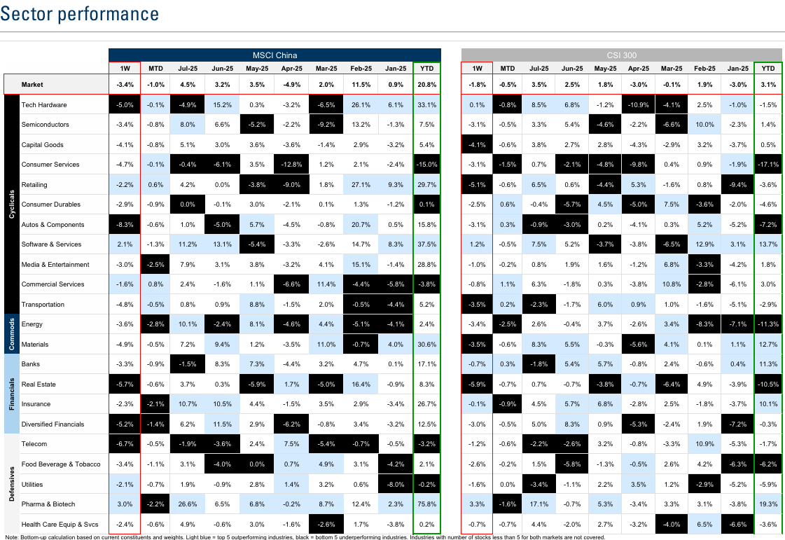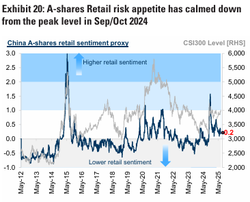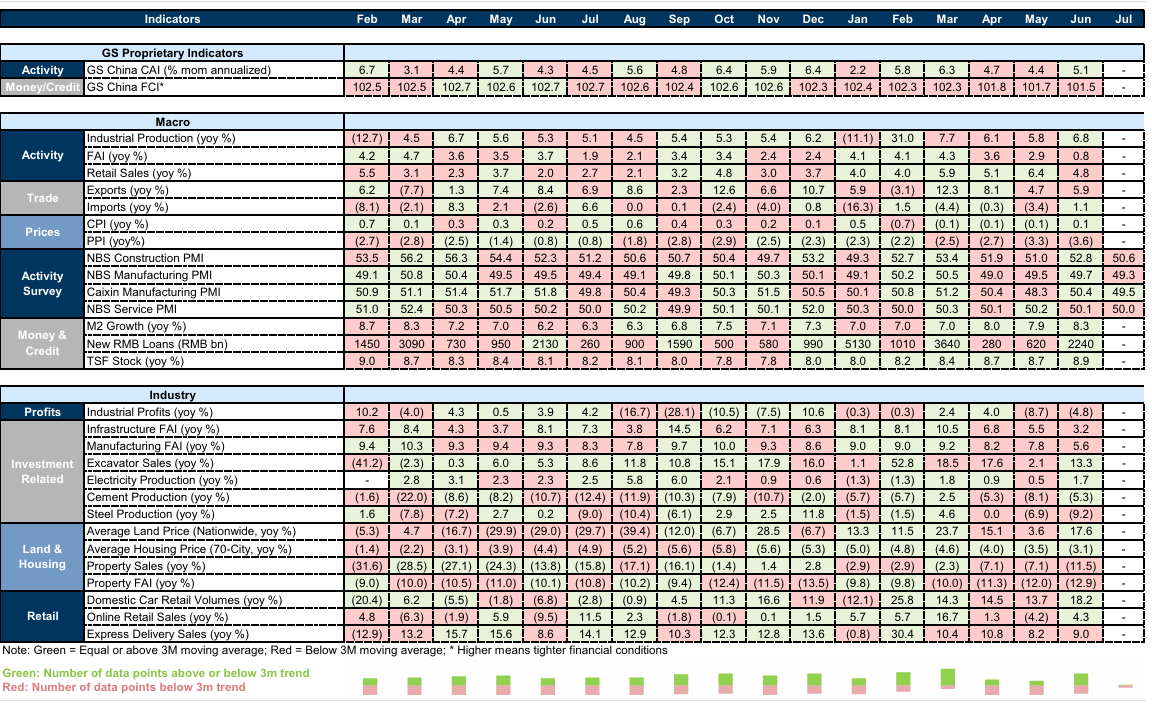 중국 시장은 YTD 최고치에서 2-3% 하락. 7월 정치국 회의에서 경기 부양책에 대한 긴급성이 낮아짐