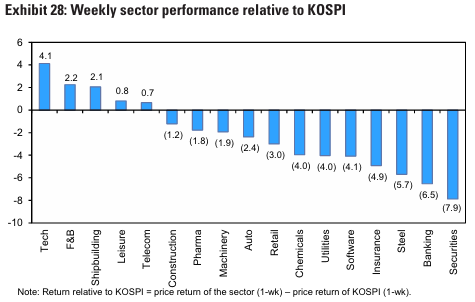 이번주에는 기술, 음식료, 조선업 강세 / 은행, 증권업종이 큰폭으로 하락