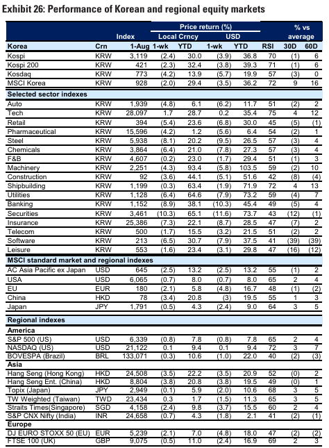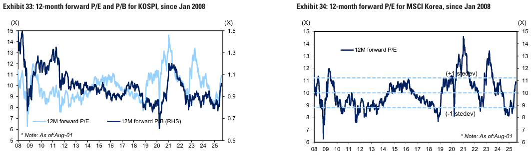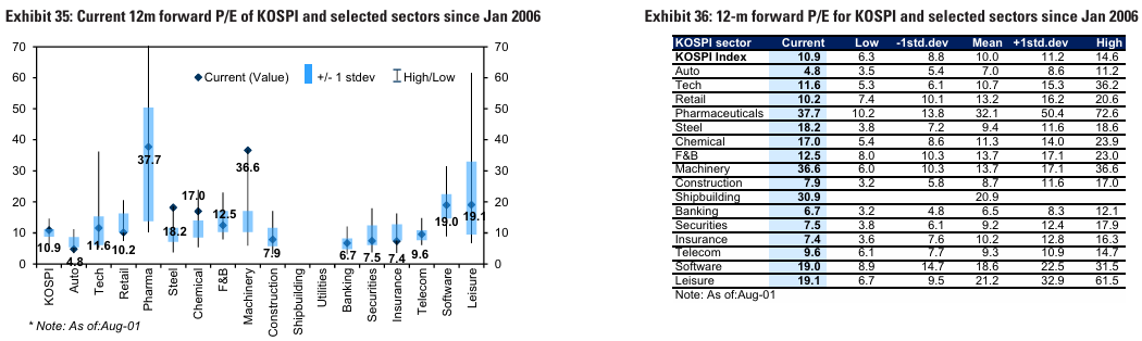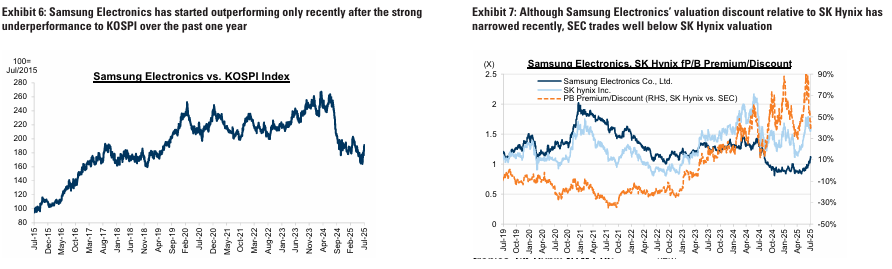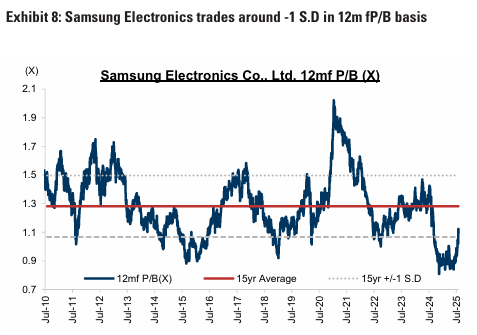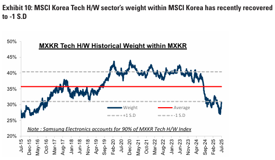 또한, MSCI 한국 지수 내 기술 H/W 섹터의 비중은 최근 -1 SD로 회복. 삼성전자가 높은 비중을 차지하는 기술 H/W의 밸류에이션 회복 가능성은 시장 전체에 6%의 추가 상승 여력을 제공할 수 있음