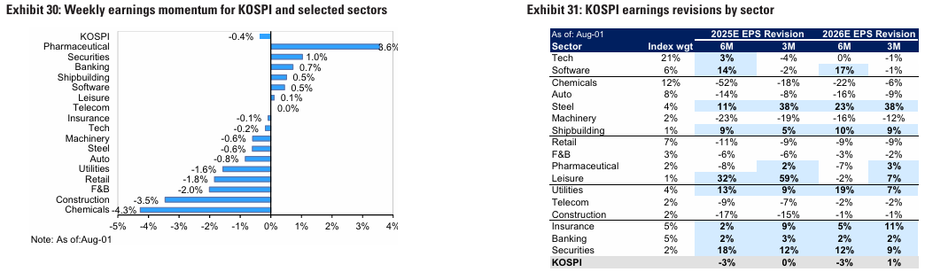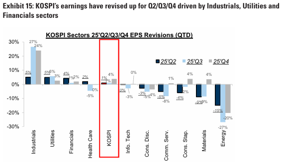 2025년 2 분기 실적은 2분기 실적 발표 시즌의 역사적 평균보다 낮음. 2분기 실적 발표 시즌 동안, 산업재, 유틸리티, 금융업종이 주도하여 코스피 지수의 2분기, 3분기, 4분기 실적이 상향 조정됨.