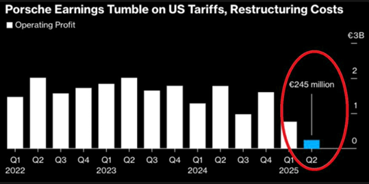 포르쉐는 전에 분기당 20억 유로의 영업이익을 남겼으나 지금은 2억 4,500만 유로로 줄어듬. 독일의 가장 상징적인 자동차 회사조차 관세로 인해 고전한다면 다른 회사들은?