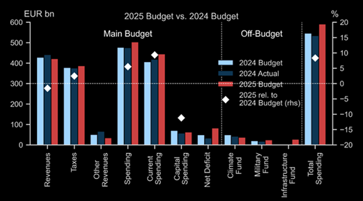 2025년 독일은 24년보다 수입은 감소, 지출은 증가, 적자도 증가