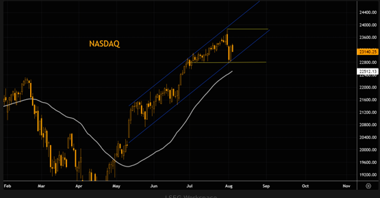 SPX와 나스닥 차트 : 저항은 최고점 / 지지선은 50일선. 현재 5월부터 형성된 추세 채널 안에서 거래되는중