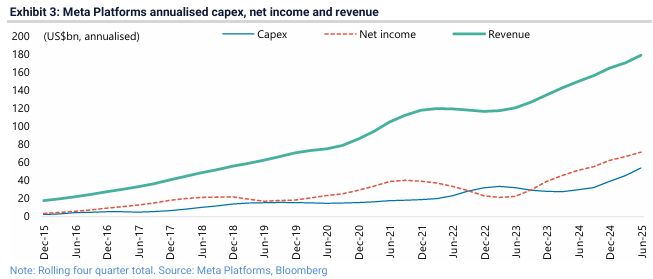 4대 하이퍼스케일러가 올해 350B, 내년 가이던스 컨센 추정치를 기준으로 400B 이상을 지출하여 AGI를 추구하는 것은 이 기술이 성장 동력 & 파괴적 위협의 원천이라는 것을 의미함. AI 군비 경쟁에 참여하지 않을 경우, 뒤쳐질 수 있다는 두려움이 존재하는 것으로 보임. "자산 경량화" 기업이 아니게 되더라도 이 기업들은 충분한 현금 흐름을 만들고 있음.