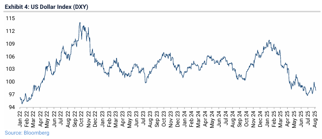 S&P 500의 PSR은 7월에 3.35로 최고 기록을 달성했고 현재는 3.33임. 하이퍼스케일러와 엔비디아의 상승세에 힘입어 미국은 MSCI 세계 지수에서 차지하는 비중이 64.7%가 되며 회복. 하지만 24년 12월 24일의 67.2%에는 아직 미치지 못함. 이것은 저번달에, 올해 처음으로 달러가 강세를 보였기 때문으로 보임. 25년 상반기에 달러인덱스는 10.7% 하락했고, 지난 7월에 3.2% 회복함.