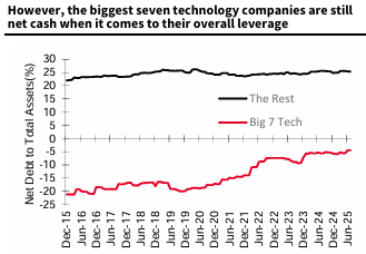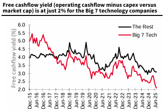 그 결과, 전통적으로 "자본지출이 적은" 기업들은 이제 전체 시장과 유사한 영업 현금 흐름의 비중을 자본지출에 할당하고 있음. 이러한 지출 증가가 일회성인지 아니면 유지보수 자본지출의 새로운 추세를 나타내는지는 아직 불확실함. 이 기업들의 전체 잉여 현금 흐름 수익률은 현재 2% 미만으로 떨어져 배당금이나 자사주 매입을 통한 주주 환원 여력이 제한적임. 이들은 대차대조표상 순현금흐름 흑자라는 이점을 유지하고 있지만, 5년 전만큼 크지는 않음.
