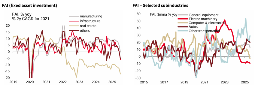 7월 중국의 경제 활동은 전반적으로 둔화됨. 산업 생산은 견조한 수준을 유지했지만, 수출이 주도했고 수출은 현재까지 회복세를 유지하고 있는 반면, 내수는 예상치 못하게 눈에 띄게 둔화됨. 소매 판매는 소비 보조금의 효과가 약화되면서 감소했으며, 투자 또한 정부의 경기 부양책이 아직 효과를 발휘하지 못하고, 이윤 감소, 과잉 생산능력, 관세 불확실성의 영향이 더욱 뚜렷해짐에 따라 모멘텀을 잃었음.