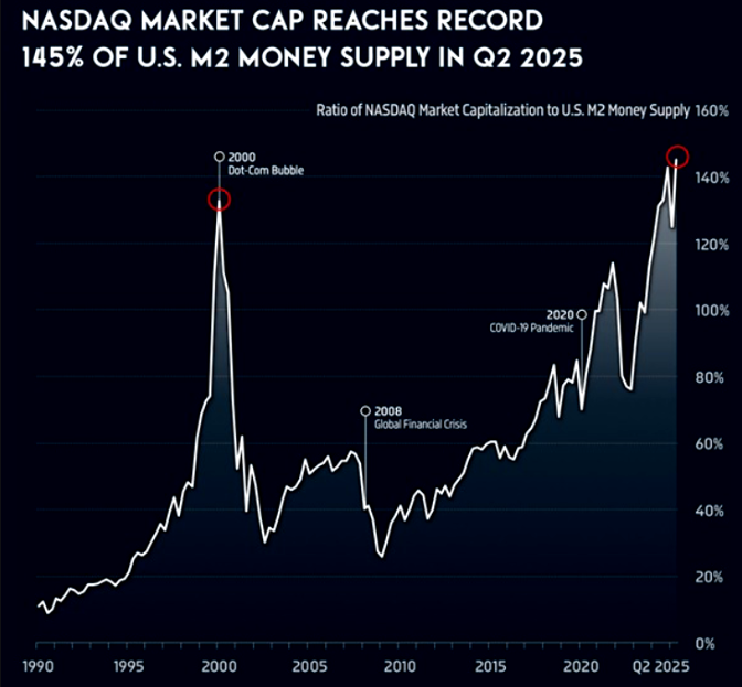 미국 M2 통화량 대비 나스닥 시가총액이 사상 최대인 145%에 도달했음. 공싱적으로 2000년 닷컴 버블의 정점을 넘어섬.