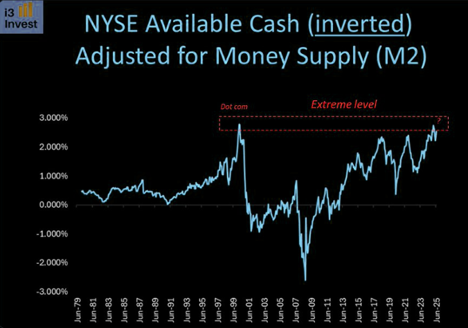 NYSE의 현금이 감소한다는 것은 투자자들이 주식에 과도하게 투자하고 있다는 것을 의미함.