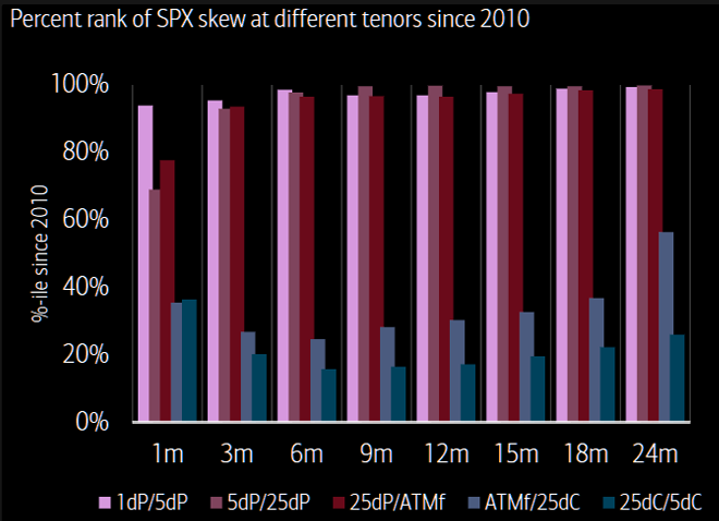 "SPX 풋 스큐, 특히 장기 테일 스큐는 오늘 사상 최고치에 근접했음." 풋 스프레드는 변동성 측면에서 비교적 매력적임.