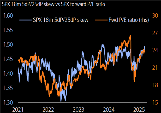 2. 주식 : 2년 연속 P/E 비율 상승, SPX 스큐는 이에 맞춰 가팔라지고 있음.